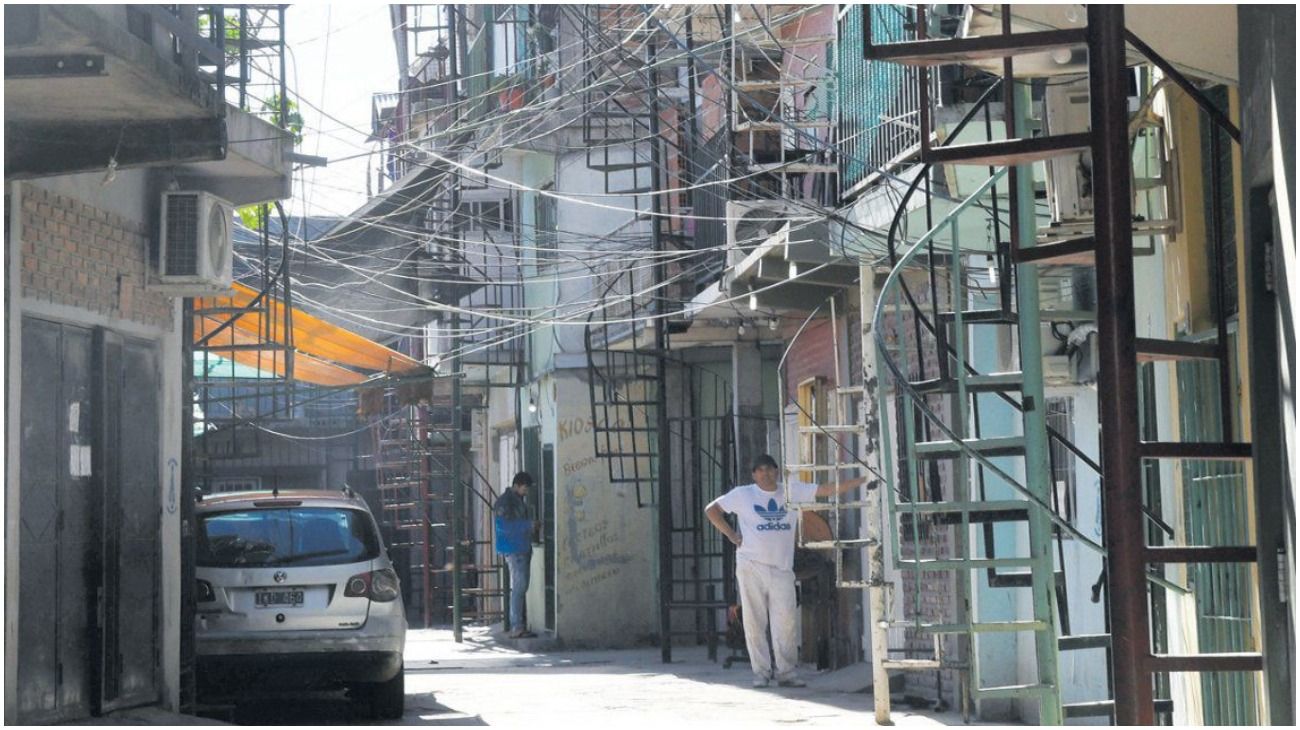 Mientras tanto, en las calles angostas y en los pasillos de la villa, se observa la ausencia de criterios acerca de las instalaciones eléctricas mínimas establecidas por la normativa vigente. Los cables cuelgan a baja altura, se apoyan sobre techos de chapa, sobre balcones o sobre muros húmedos y conviven con árboles, rejas, estructuras metálicas y postes de alumbrado.